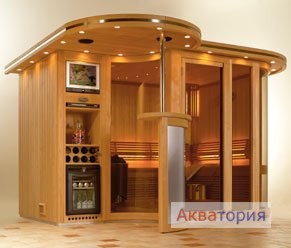Внутри везде присутствует гармония: лавки с декоративными карнизами, удобные спинки со скрытой подсветкой дают прекрасную возможность наслаждения. Сау-на, готовая к сборке включает: изолированные стенные и потолочные секции, алюминиевую анодированную раму, арматуру для электрического кабеля, осве-щение, трансформатор, угловые и потолочные рейки, вентиляционные окошки, барную стойку, необходимые для сборки детали. Внешняя высота 203 см. Нагре-ватель (8 kW) вы можете выбрать. Также добавьте сюда холодильник, CD плеер и ТВ